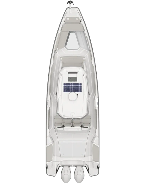 The forward-extending hardtop contributes to the boat’s modern look, offering better sun protection and when needed, airflow for the driver through its integrated skylight located in front of the helm.