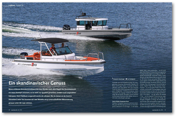 What they loved about the Axopar 28 T-Top and Axopar 28 Cabin Version R: ”The Axopar holds its course, as if on rails. Not even the slightest uncertainty can be felt. At the same time the boat follows even the smallest steering impulses - it's a real pleasure.”, “The instrumentation of the console with the height-adjustable steering wheel leaves nothing to be desired, the dashboard also convinces with a smart cut-out, which is exactly matched to an iPad.”, “The hull, which is reminiscent of a RIB with a deep V-cut and three bilge edges, gives high stiffness. It does such a good job that even driving at max speed - 80 km/h - is a pure pleasure. In all driving conditions - also in curves and crossing waves - the Axopar is extremely stable and at the same time responds excellently to steering impulses. Even beginners can easily master the boat, a bow thruster supports harbour maneuvers.”, ”The dimensions of the berth amaze with 2.0 m in length and 1.22 m in width.”, “The whole execution of the Axopar 28 is convincing: with solid handrails in the right place, rarely seen in this powerful dimensioning – up to 5 cm in diameter, with wide side decks that are comfortable to move around on, and an intelligent use of space as well as exceptional handling… What more could you want?”
