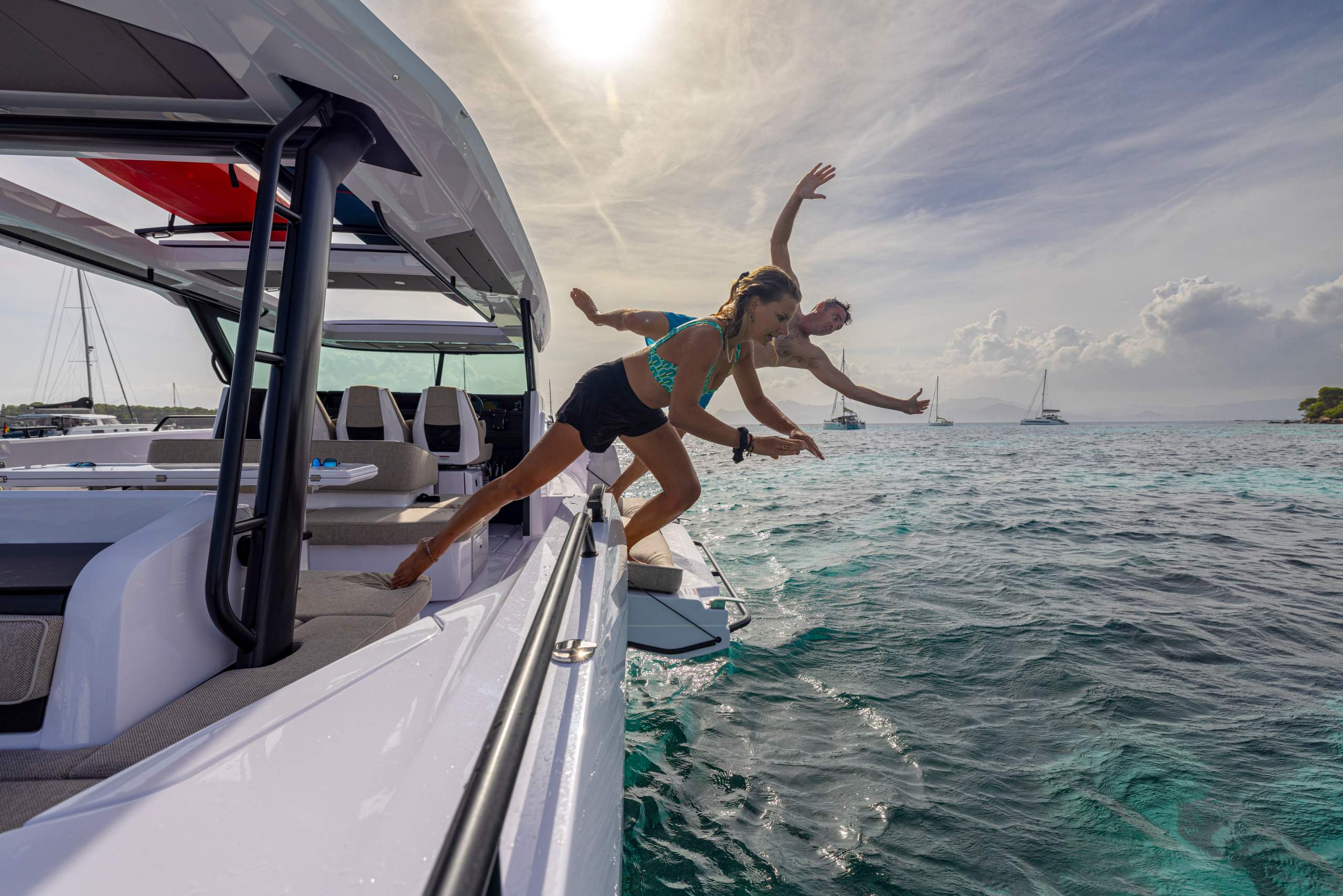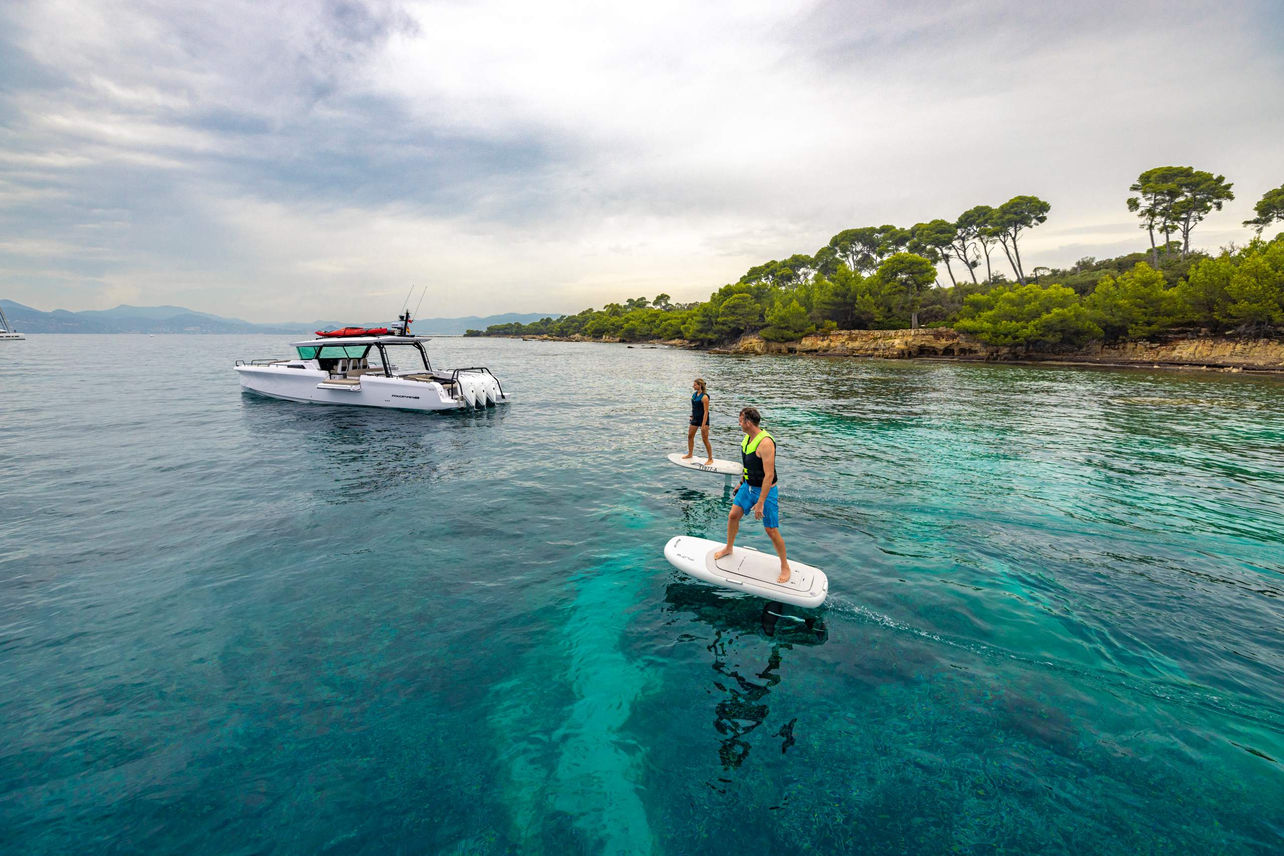 After a full week at the Cannes boat show, we had planned a photoshoot day on the water. We got up early to make the most of the day and gathered at the breakfast table, eager to spend a day boating and creating content. The weather was a concern with gray skies and drizzle, and we kept checking the forecast, hoping for good news. But the rain didn’t stop us; our excitement was clear as we carried our watersports gear to the boat. The French Riviera awaited us, promising a day full of fun on the water.