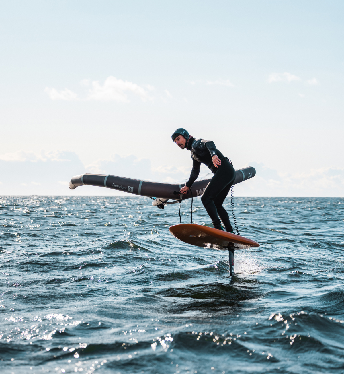Wing surfing, sometimes referred to as wing foiling, is a wind powered adventure watersport, where an inflatable hand-controlled wing is used to generate the power to ride a wing foil board at speeds up to 30 knots. A submerged hydrofoil, shaped like an airplane wing, is attached to a mast at the bottom of your board, raising it above the water surface and giving you that sensation of flying.