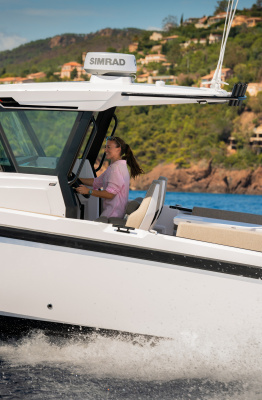 On the Axopar 22, the upgrade features a Mercury Verado V8 250hp engine in black or white with pre-rigging and propeller, while the Axopar 25 is equipped with a powerful Mercury Verado V8 300hp engine. BRABUS wrapping on the hull and roof is available on the 22 T-Top model and the 25 Cross Top model. For both ranges, the option is offered exclusively with the BRABUS Trim Line.