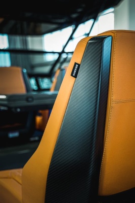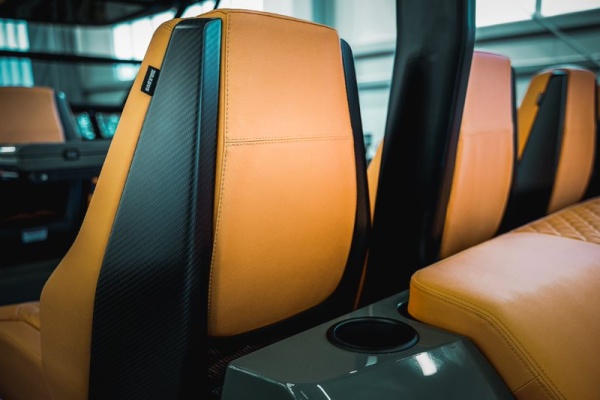 At first glance, the boat impresses with an evocative BRABUS 1-Second-Wow design scheme, combining a distinctive paint job in BRABUS “Stealth Green” with matching Signature Style graphics, a wide range of high-grade carbon elements, contrasting matte black detail work, Masterpiece and Sign of Excellence badges as well as the BRABUS “Sunrise” upholstery color. The confident contrasts in color and material exude a highly luxurious, contemporary outdoor aesthetic – in this combination a most unique design transfer that guarantees owners will stand out from a crowd, anywhere.
