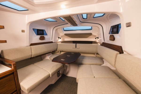 - Reinterpreted wheelhouse seating layout with twin sofa configuration and table.