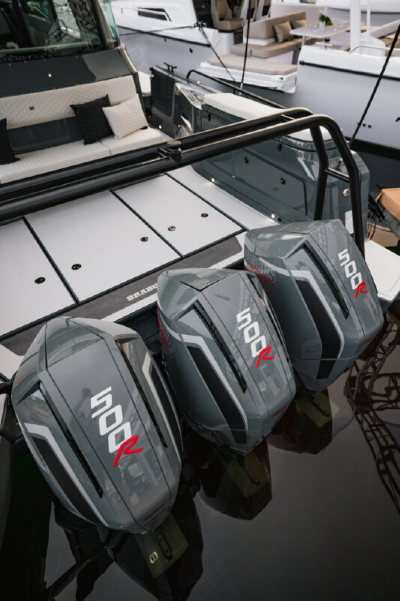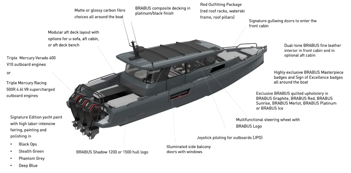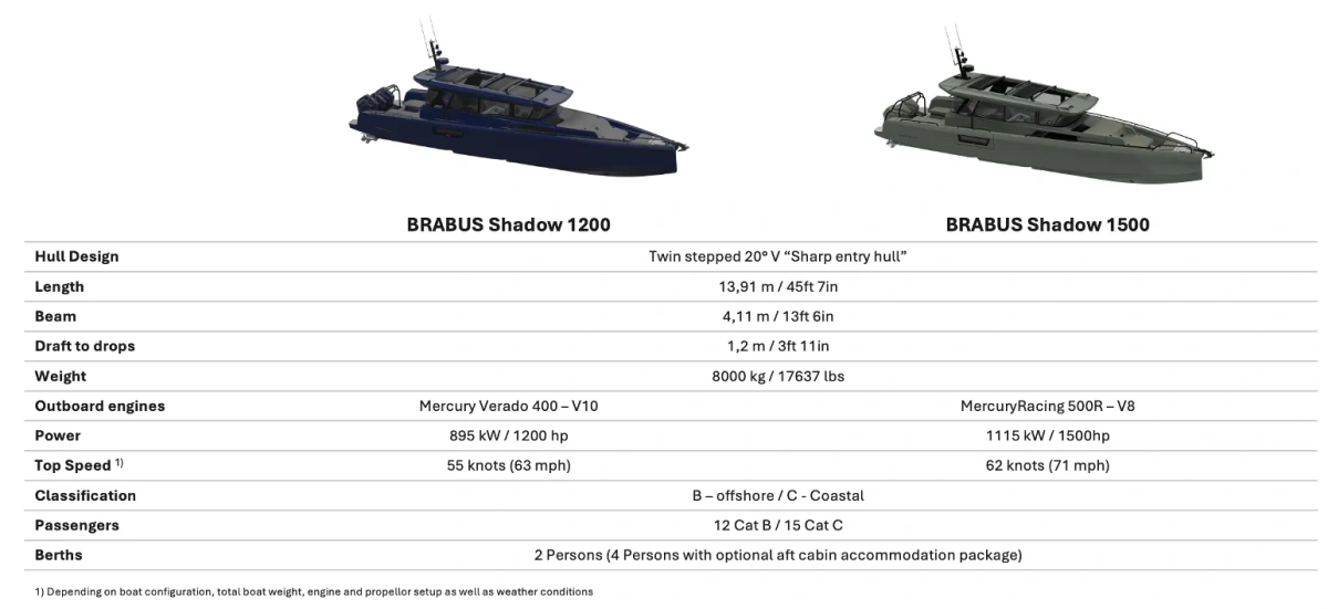 - Shadow 1200: Triple Mercury Verado 400 5.7l V10 outboard engines with a combined power output of 1,200 hp (885 kW) with painted engine covers and BRABUS engine decals