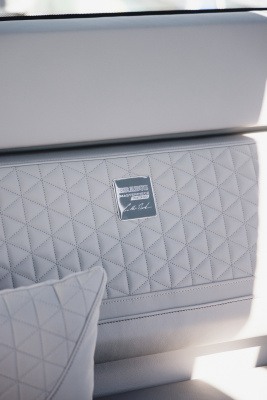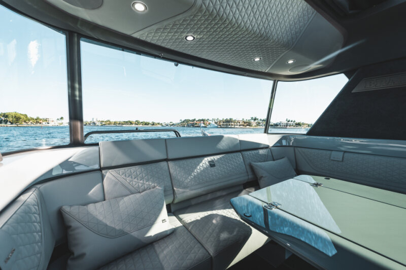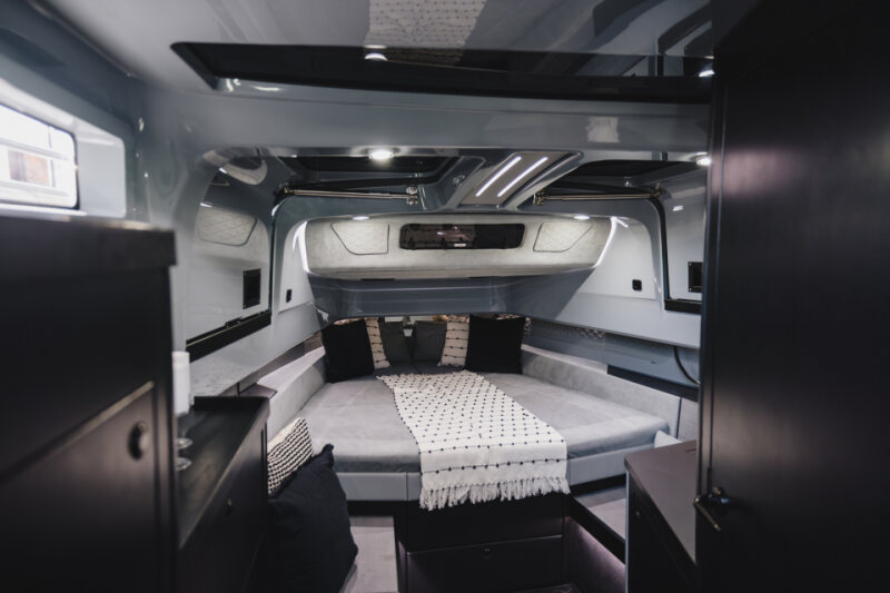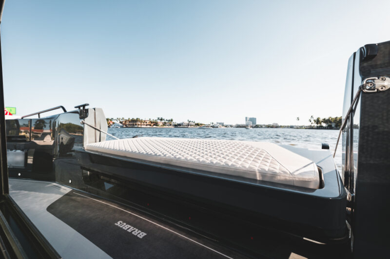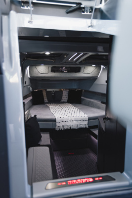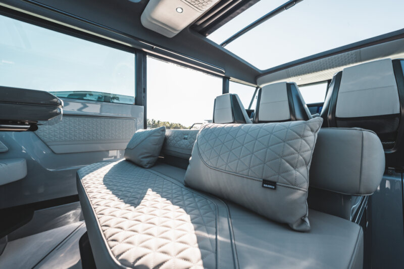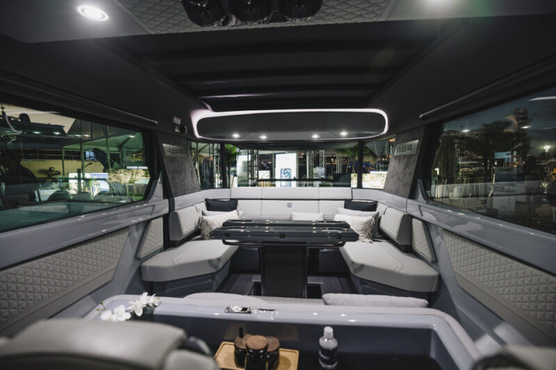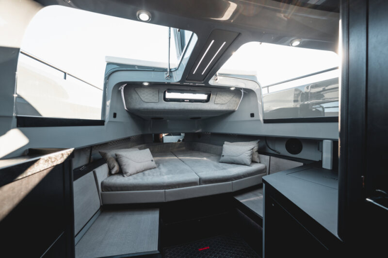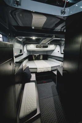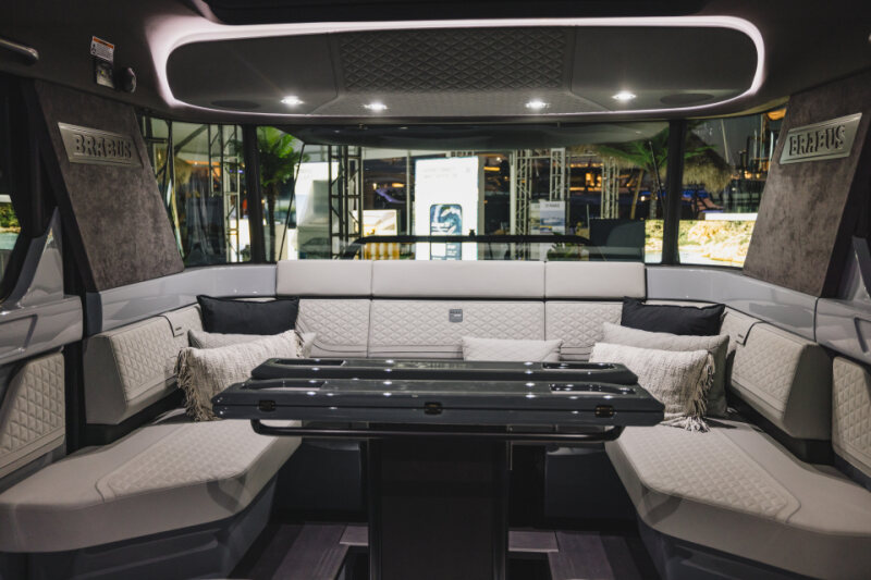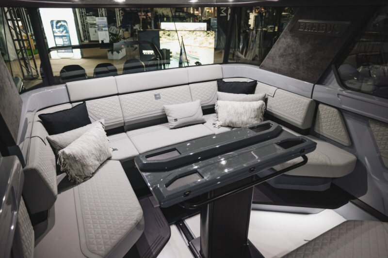 - Front lounge and optional aft-cabin in exclusive BRABUS Masterpiece leather in light grey/black color scheme with red accents or BRABUS Masterpiece leather light grey color scheme, and mattress in grey/black square pattern