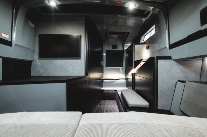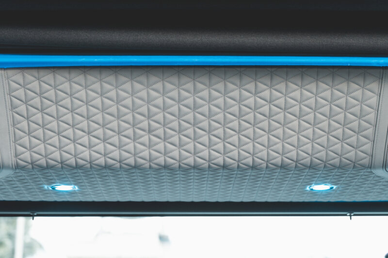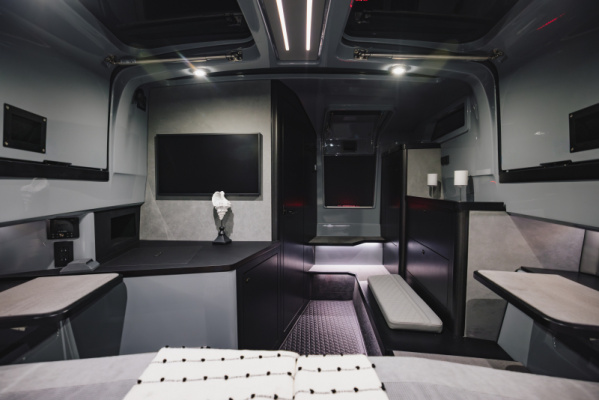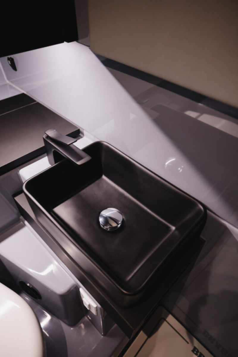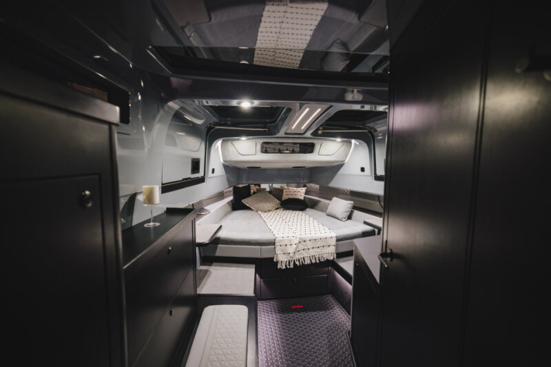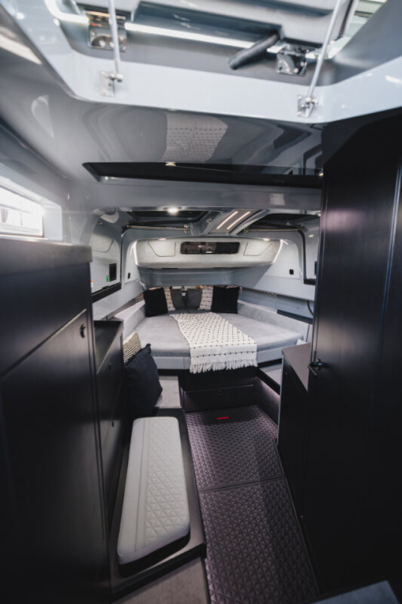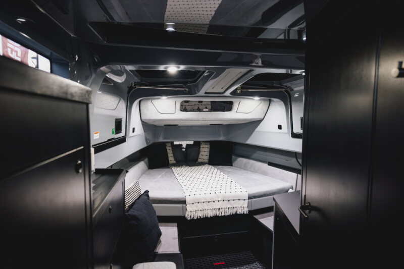 - Front lounge and optional aft-cabin in exclusive BRABUS Masterpiece leather in light grey/black color scheme with red accents or BRABUS Masterpiece leather light grey color scheme, and mattress in grey/black square pattern