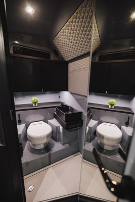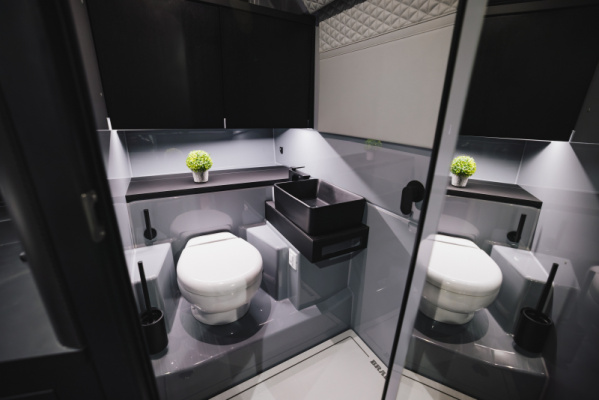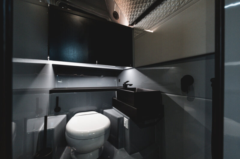 - Bathroom in the front lounge with shower, sink and toilet