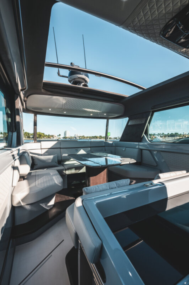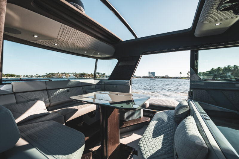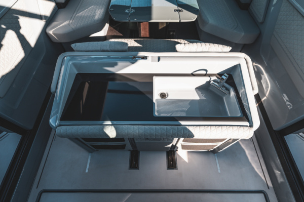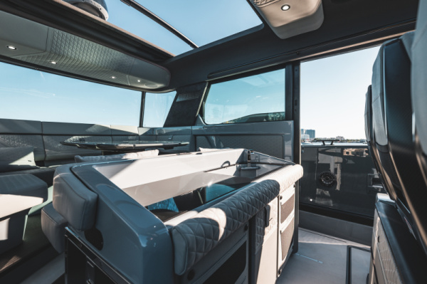 - Adjustable table between aft bench and wet bar