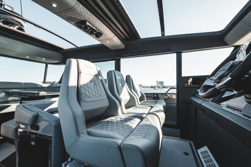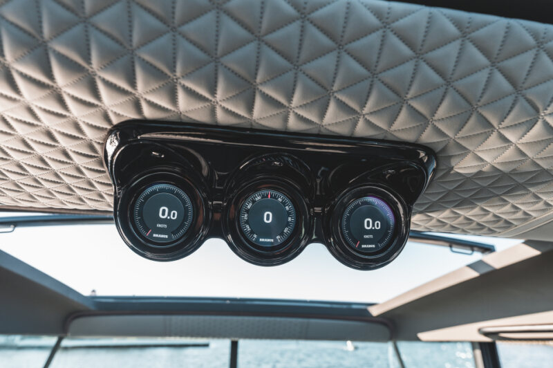 The helm setup is deliberately configured without Joystick Piloting for Outboards (JPO) as standard, ensuring the most direct connection between driver and machine at high speeds. For clients prioritizing docking assistance and advanced positioning control, JPO is offered as an optional system upgrade.