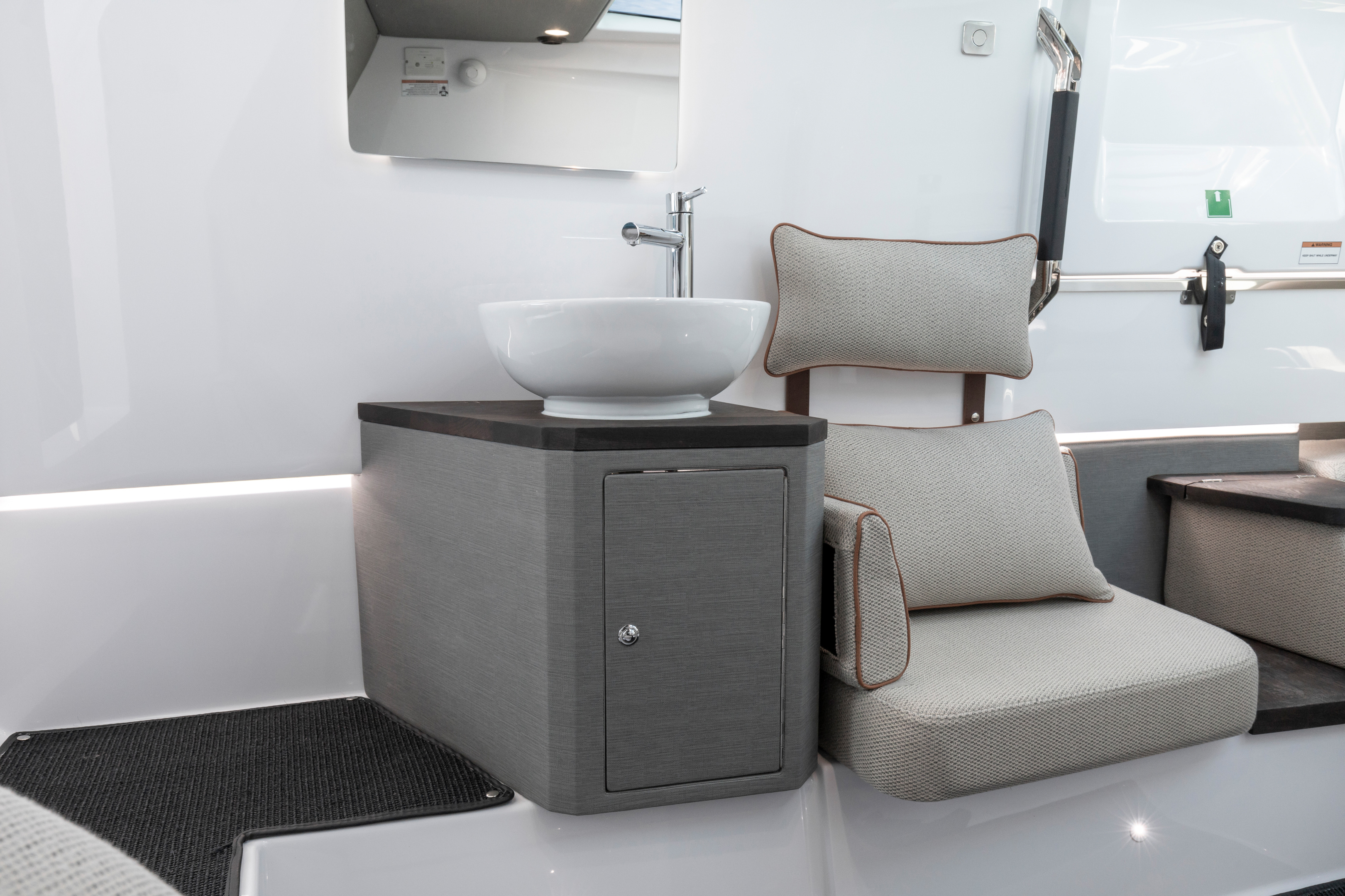 An optional fully enclosed toilet compartment with the standard toilet bowl moved to the starboard side, mounted transversely. Corian top with sink, faucet and a small storage compartment. Further upgradable with an optional shower compartment.