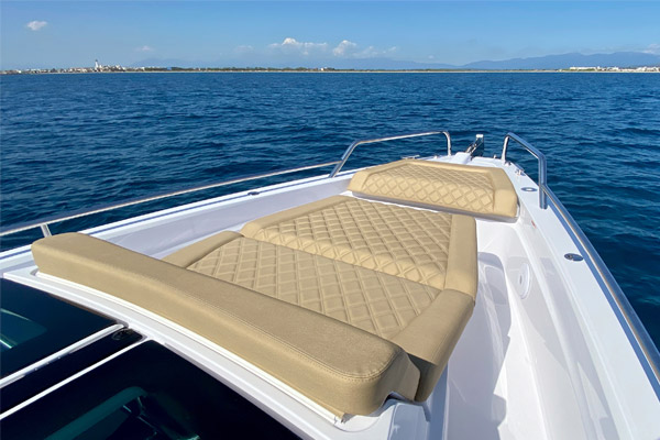 The upholstery consists of exclusive and subtle yet stylish detailing with accentuated patterns and a structured feel of marine fabrics, complimented by contrast-colored pillows and piping details. The fabric keeps the interior and lounging areas at comfortable temperatures, even on the warmest summer days.